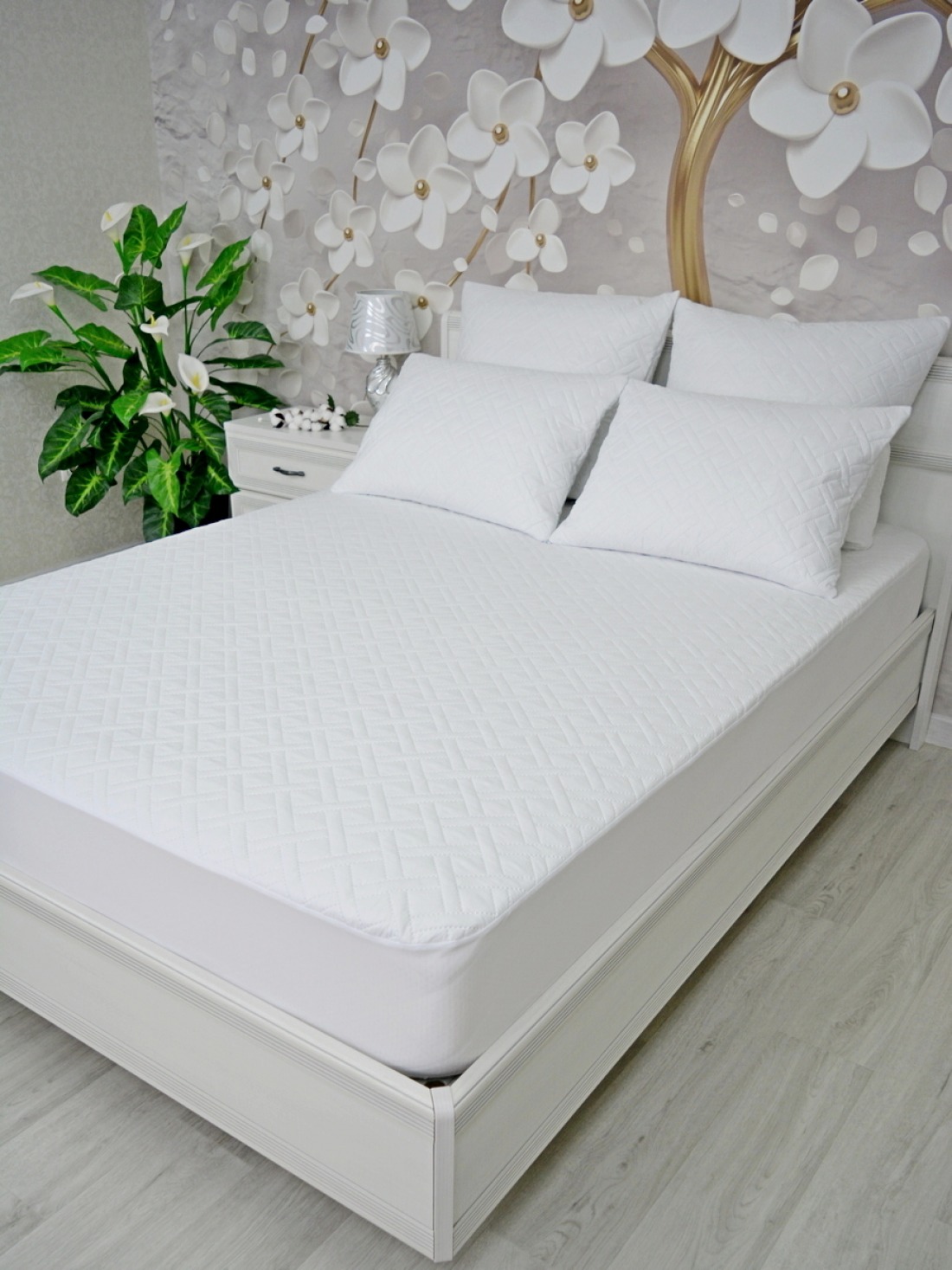 Наматрасник стеганый с бортом на резинке по всему периметру. Борт высотой 35 см., подходит на высоту матраса от 10 до 30 см.